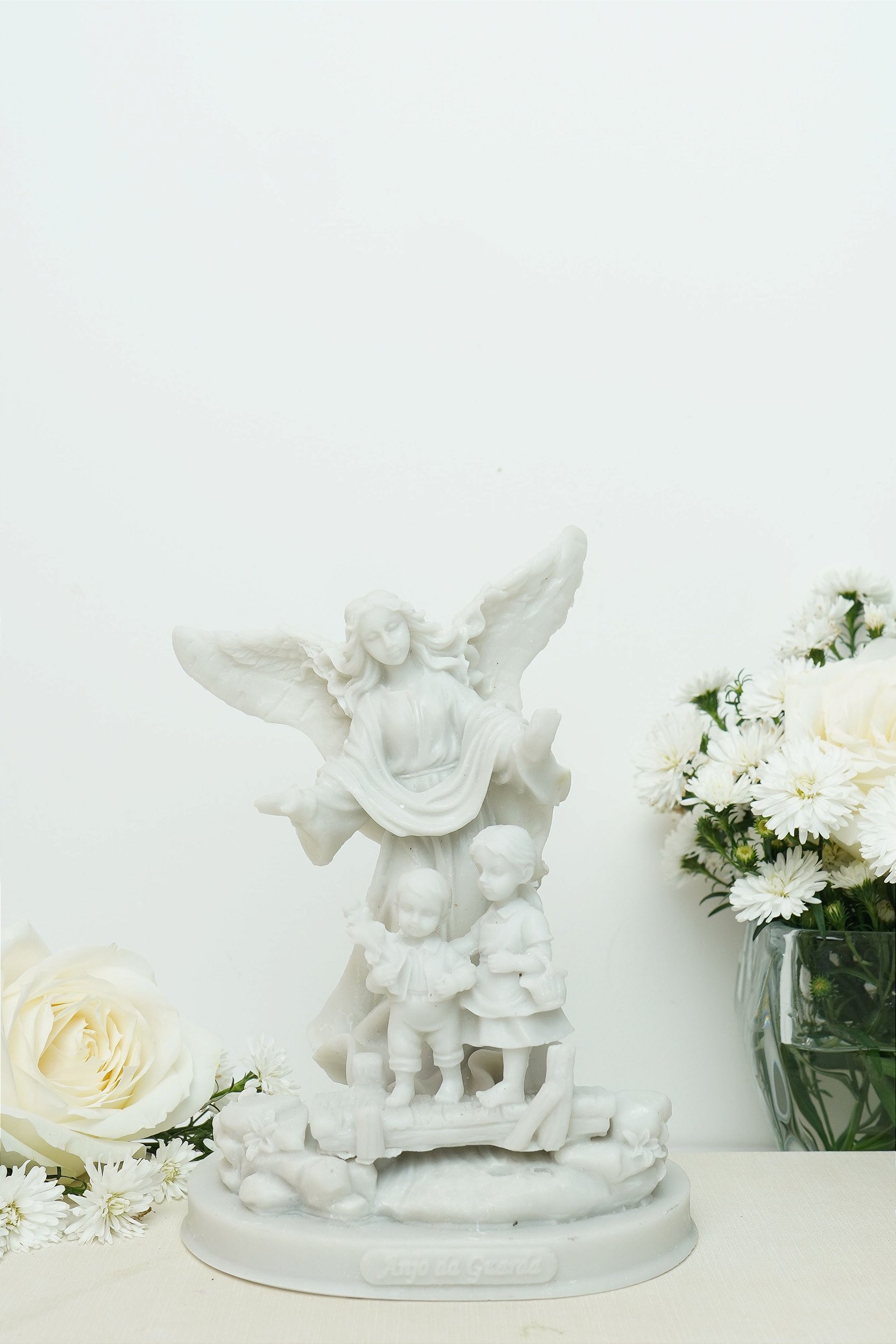 Imagem do Anjo da Guarda, produzida em resina, com acabamento totalmente branco, transmitindo pureza, serenidade, simbolizando a presença constante dos anjos que guardam, protegem e guiam cada pessoa em seu caminho.