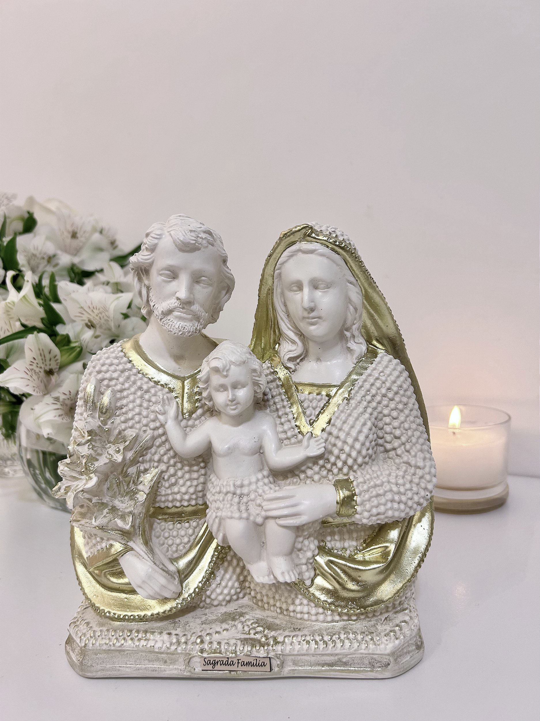 Imagem da Sagrada Família em gesso, delicadamente trabalhada em acabamento branco com detalhes dourados. Representa São José, a Virgem Maria e o Menino Jesus em uma bela cena de união e amor familiar. A imagem transmite serenidade e fé, sendo perfeita para oratórios, altares domésticos ou para presentear alguém especial.