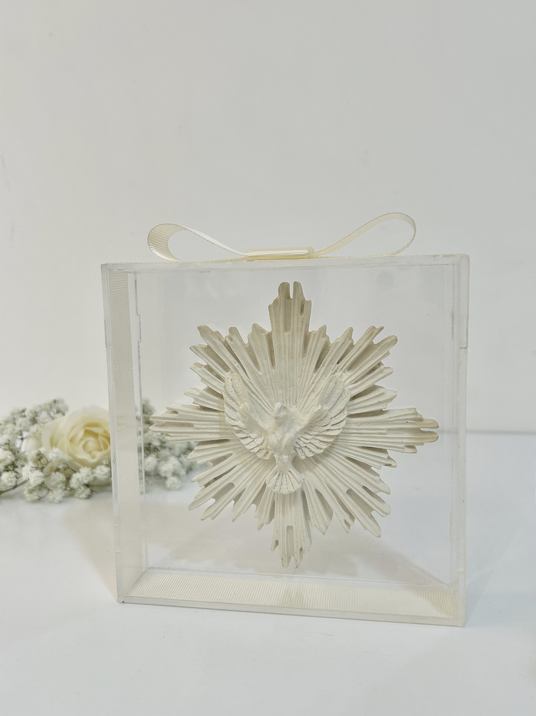 A Caixa Acrílica Espírito Santo é um item decorativo sofisticado que traz um toque de fé e elegância para qualquer ambiente. Fabricada em acrílico transparente de alta qualidade, a peça destaca o símbolo do Espírito Santo em relevo, com acabamento delicado em tom bege.