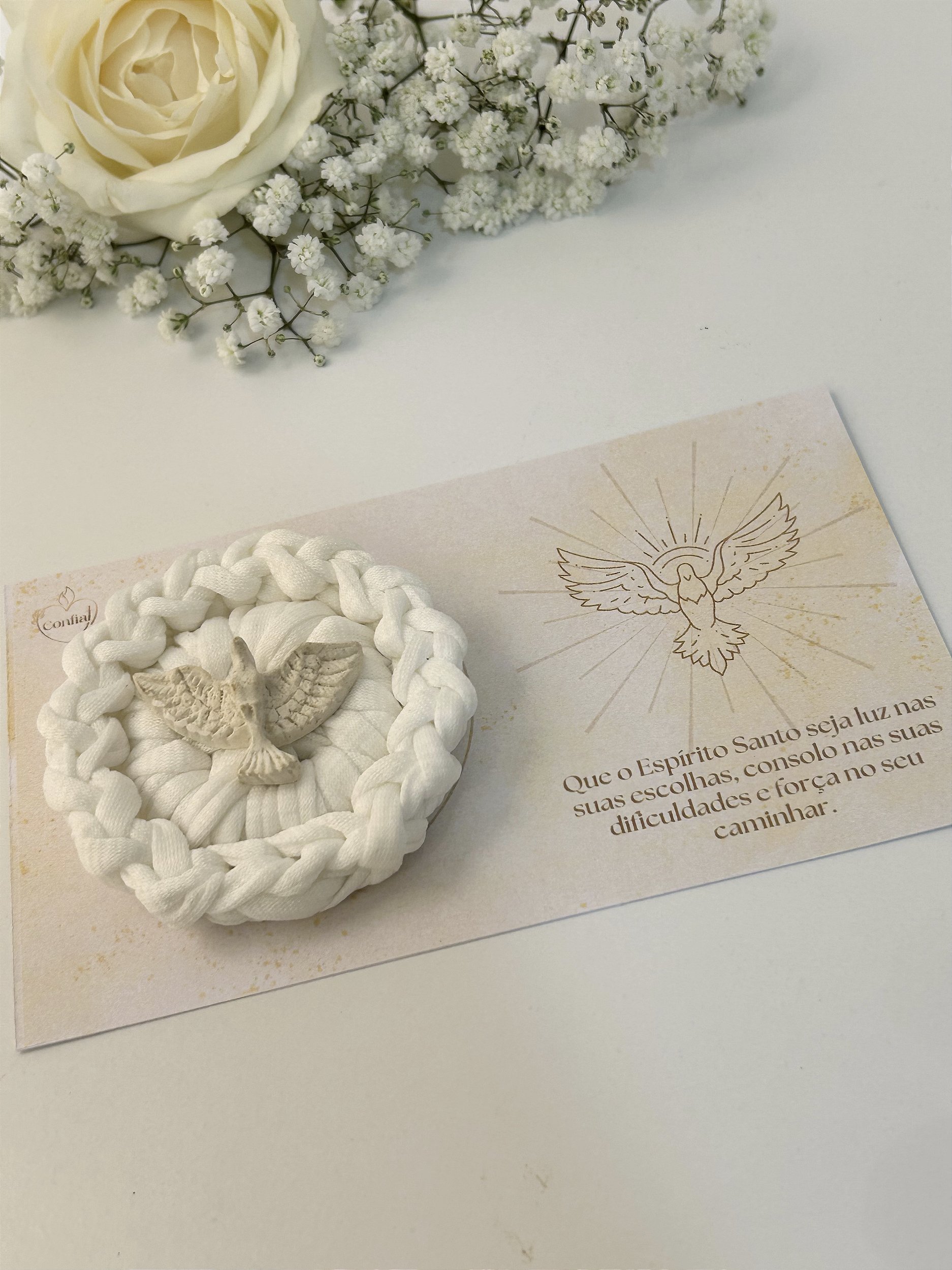 O Chaveiro Espírito Santo é uma peça artesanal que une fé e estilo. Produzido com fio de malha branco trançado e o pingente do Espírito Santo em formato de pomba branca em gesso, simboliza proteção e espiritualidade. Ideal para quem busca um acessório com significado e design delicado para organizar suas chaves com charme e personalidade.