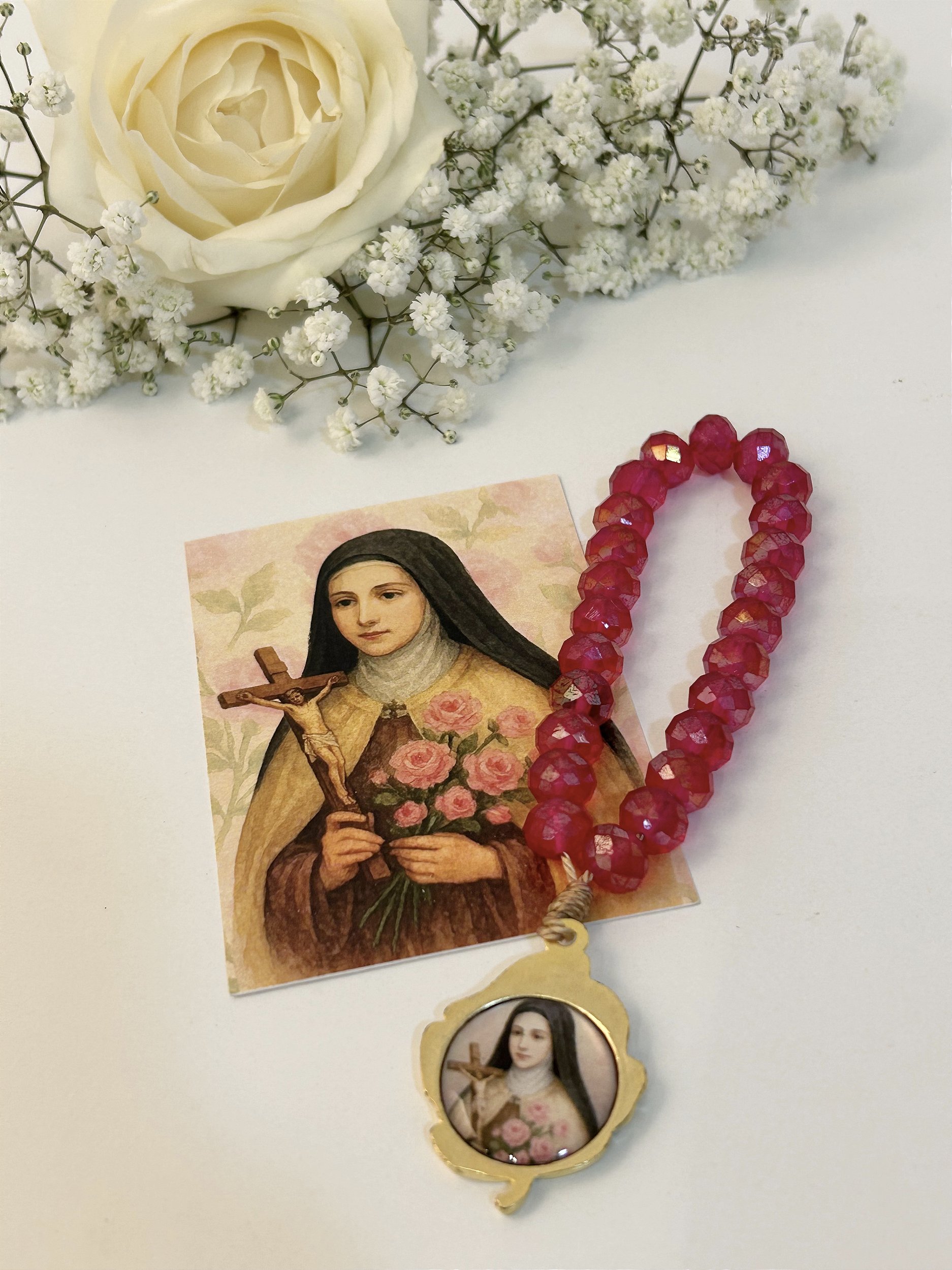 Delicada e cheia de significado, esta dezena de Santa Teresinha do Menino Jesus é um convite à oração simples e confiante, inspirada na “Pequena Via” do amor. Confeccionada com contas facetadas em tom rosa, que remetem ao amor ardente e ao sacrifício.