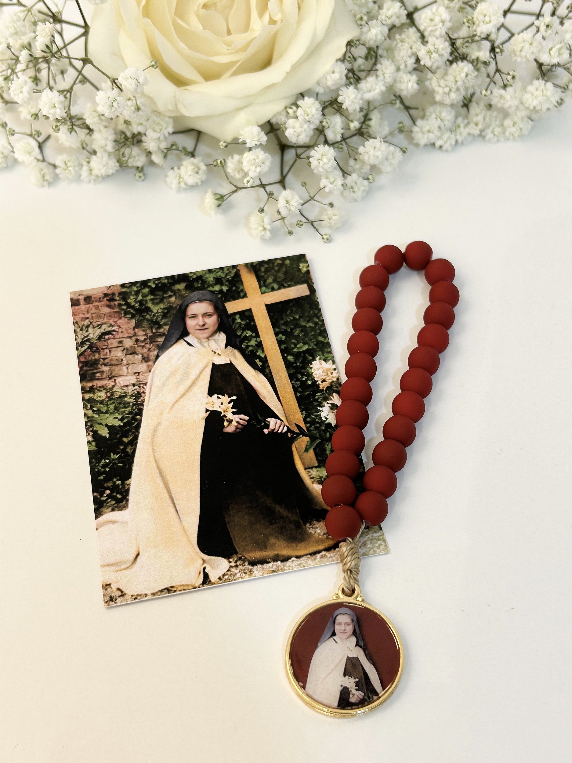 Esta coroa de Santa Teresinha do Menino Jesus é uma bela expressão de fé, simplicidade e confiança no amor de Deus, inspirada na espiritualidade da “Pequena Via”. Confeccionada com contas emborrachas em tom vermelho intenso, símbolo do amor ardente e do sacrifício oferecido com alegria, a peça convida à oração constante e confiante.