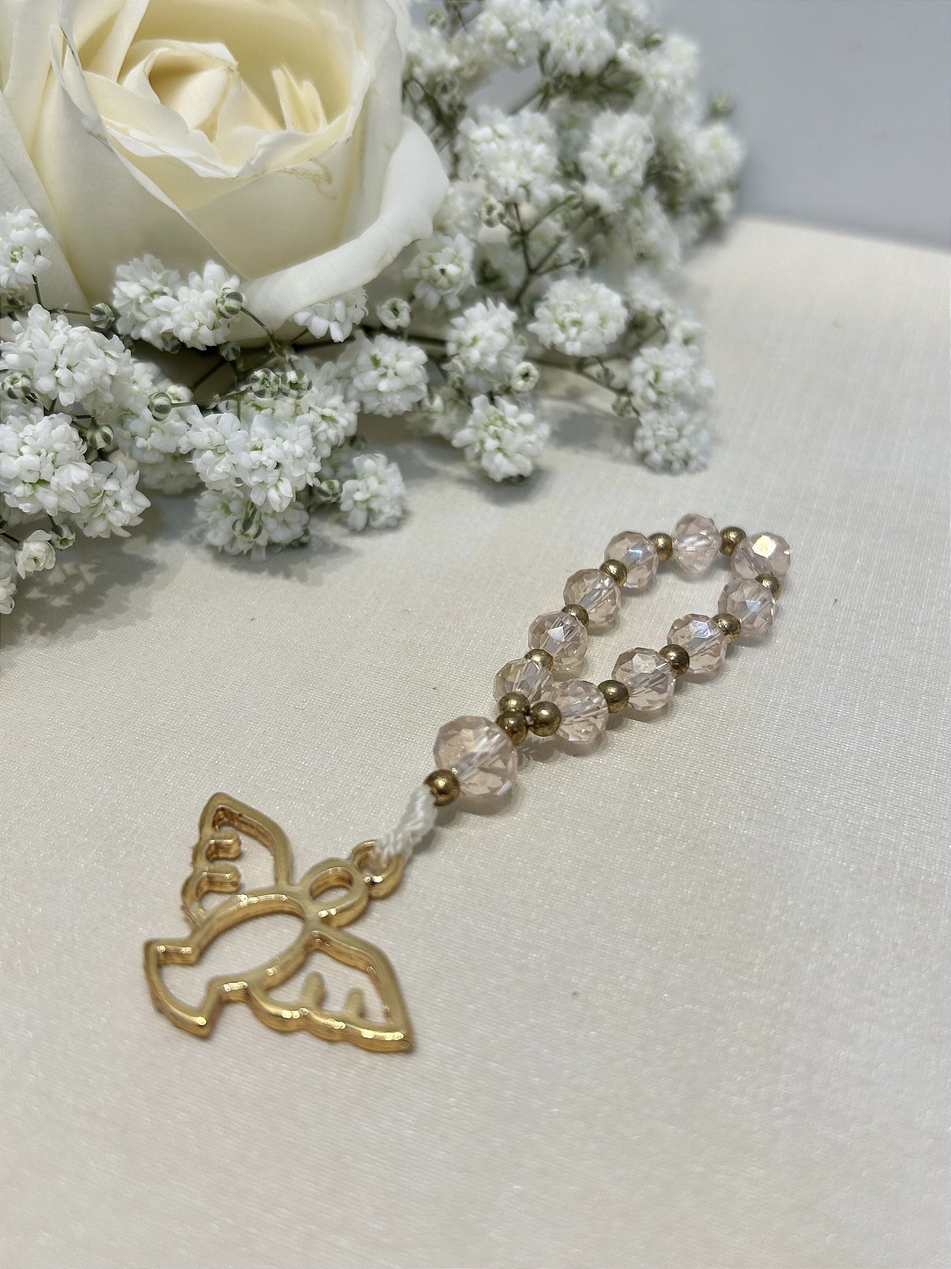 Dezena com contas delicadas cristal rosê e pingente dourado do Espírito Santo, ideal para orações e momentos de fé.