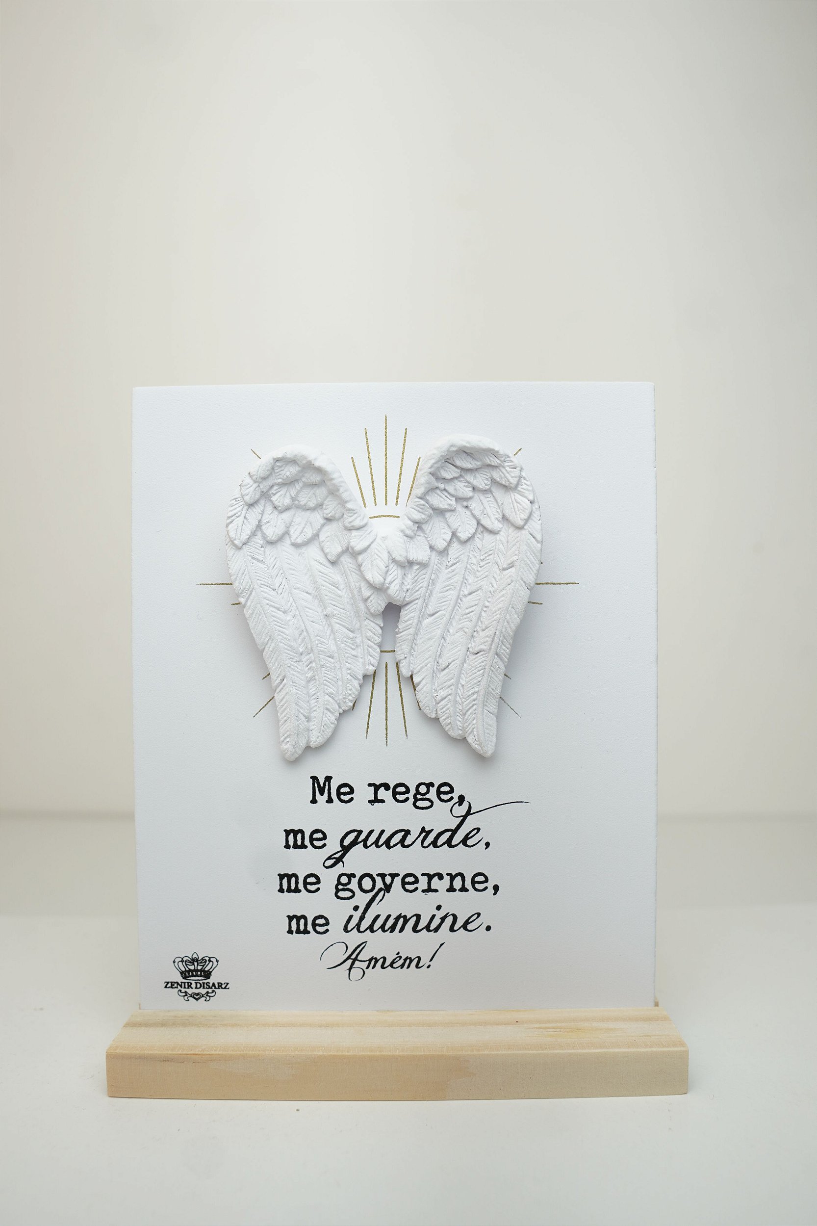 Enfeite de mesa com aplique de Asas, com oração dourado. A peça combina base em Pinus, placa em MDF estampada e aplique em gesso, unindo rusticidade e elegância. Ideal para uso devocional, decoração de ambientes ou como presente especial.