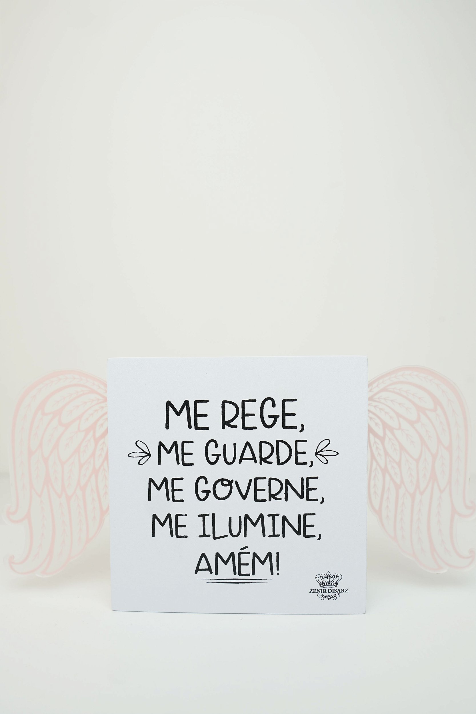 Enfeite de mesa em MDF com asas de anjo e a oração: “Me rege, me guarde, me governe, me ilumine, Amém!”. Uma peça cheia de significado, ideal para quem busca presentear com fé e amor.