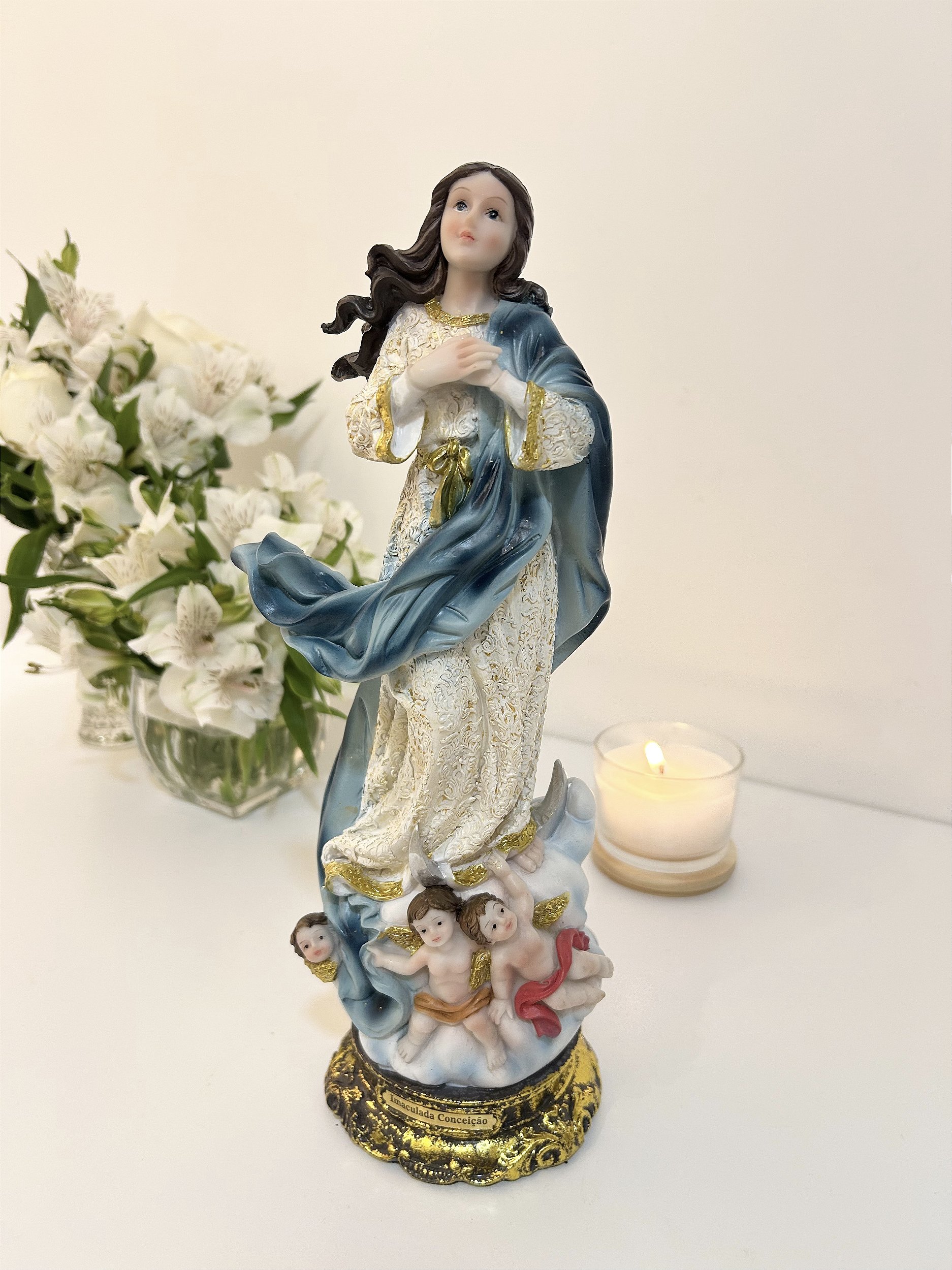 Imagem de Nossa Senhora da Imaculada Conceição, representada com expressão serena e manto azul que simboliza sua pureza e realeza. Aos seus pés, três anjos sustentam a base, reforçando o tema da vitória da Virgem sobre o pecado. A imagem possui acabamento detalhado, com delicados toques dourados e pintura artesanal que realça a beleza e a graça da Mãe de Deus.