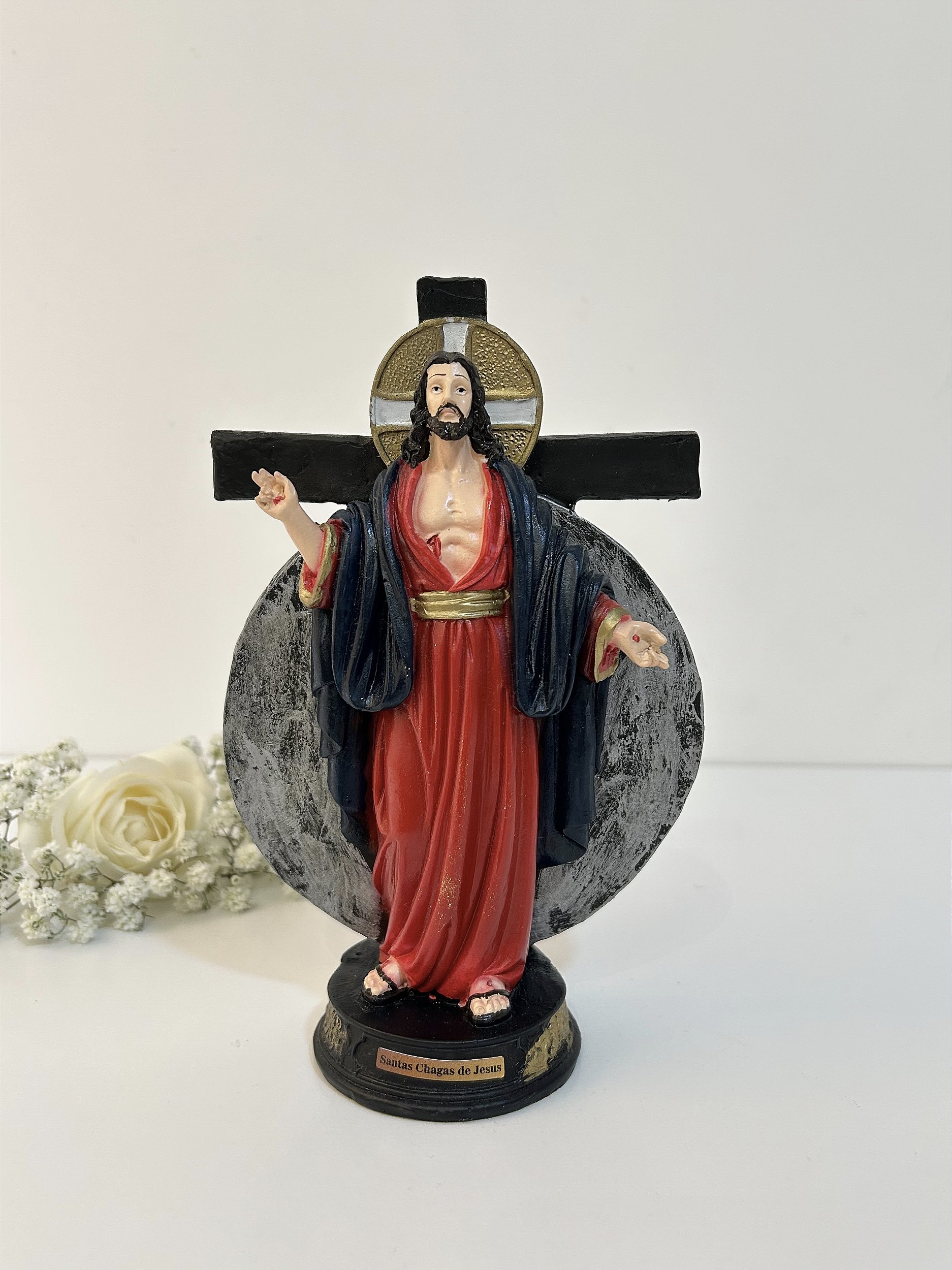 A Imagem de Jesus das Santas Chagas em resina nacional, com 20 cm de altura, representa a confiança na infinita compaixão de Deus. Seu acabamento transmite paz, pureza e fé, tornando esta peça ideal para oratórios, altares domésticos, capelas ou presentes religiosos.