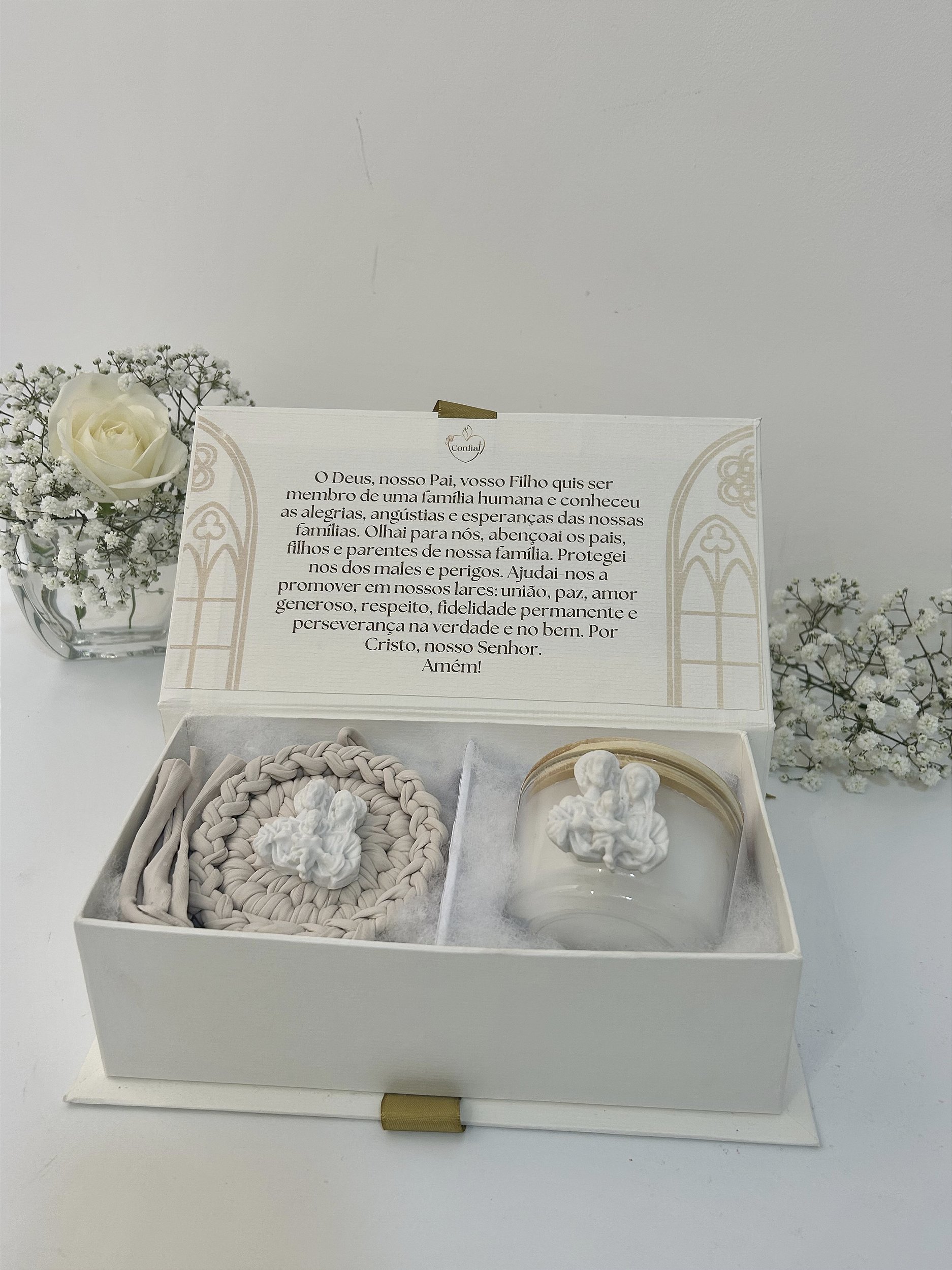 Um conjunto delicado que une fé e decoração com mandala e vela no vidro em caixa cartonada.