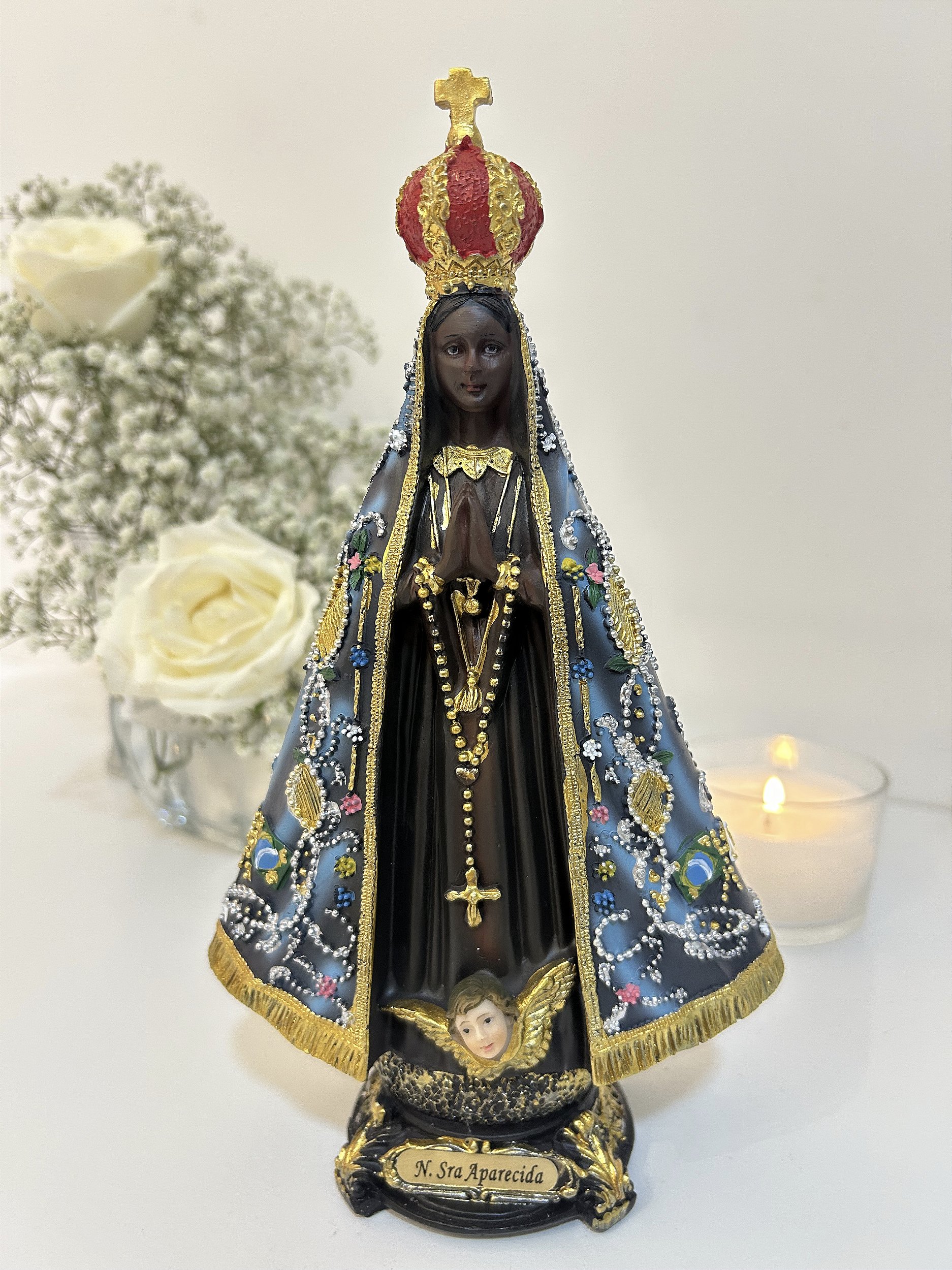 Esta imagem representa Nossa Senhora Aparecida com seu manto azul e detalhes dourados, com cerca de 22,5 cm de altura, feita em resina italiana