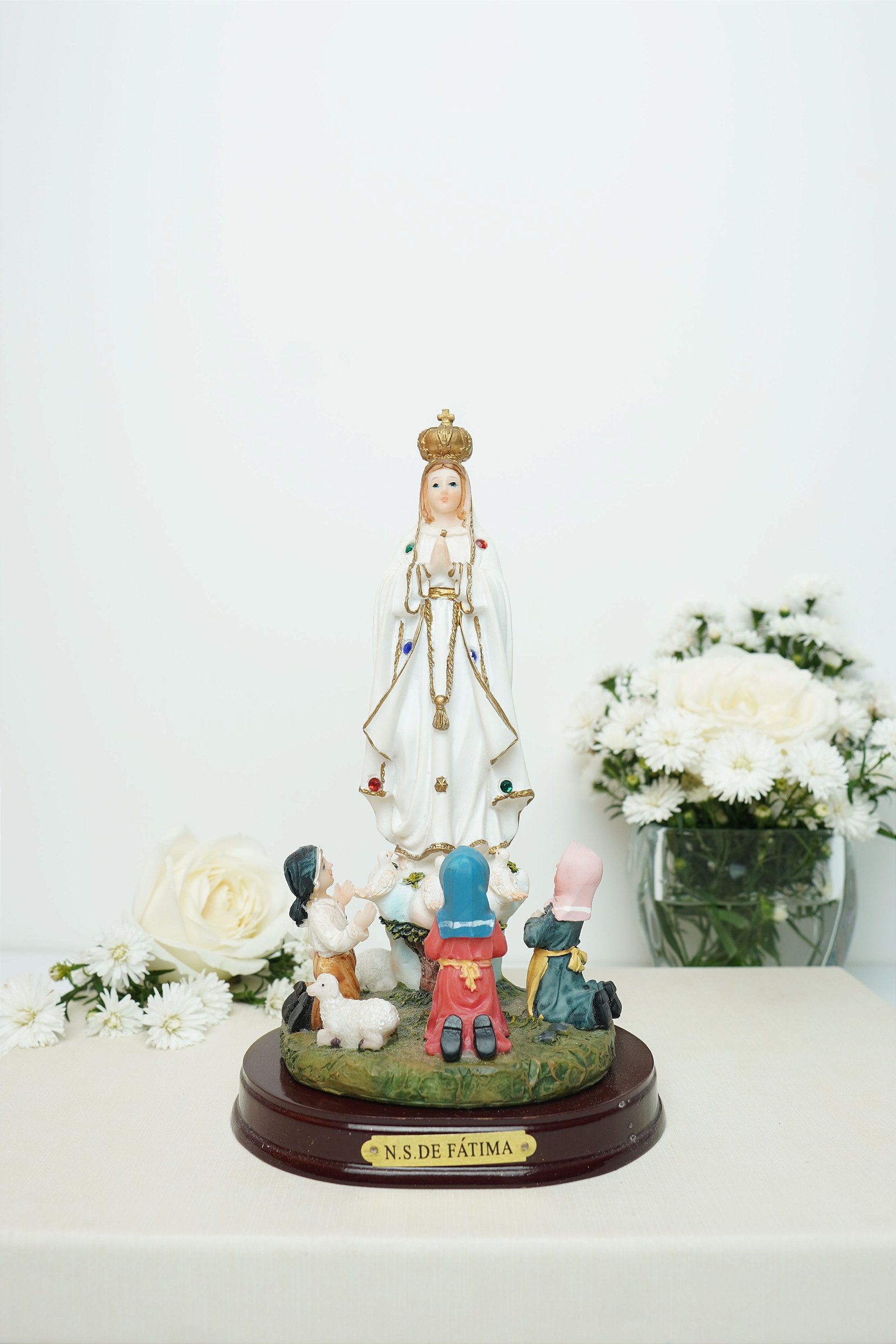 Nossa Senhora de Fátima com pastorinhos - manto branco, em resina importada.