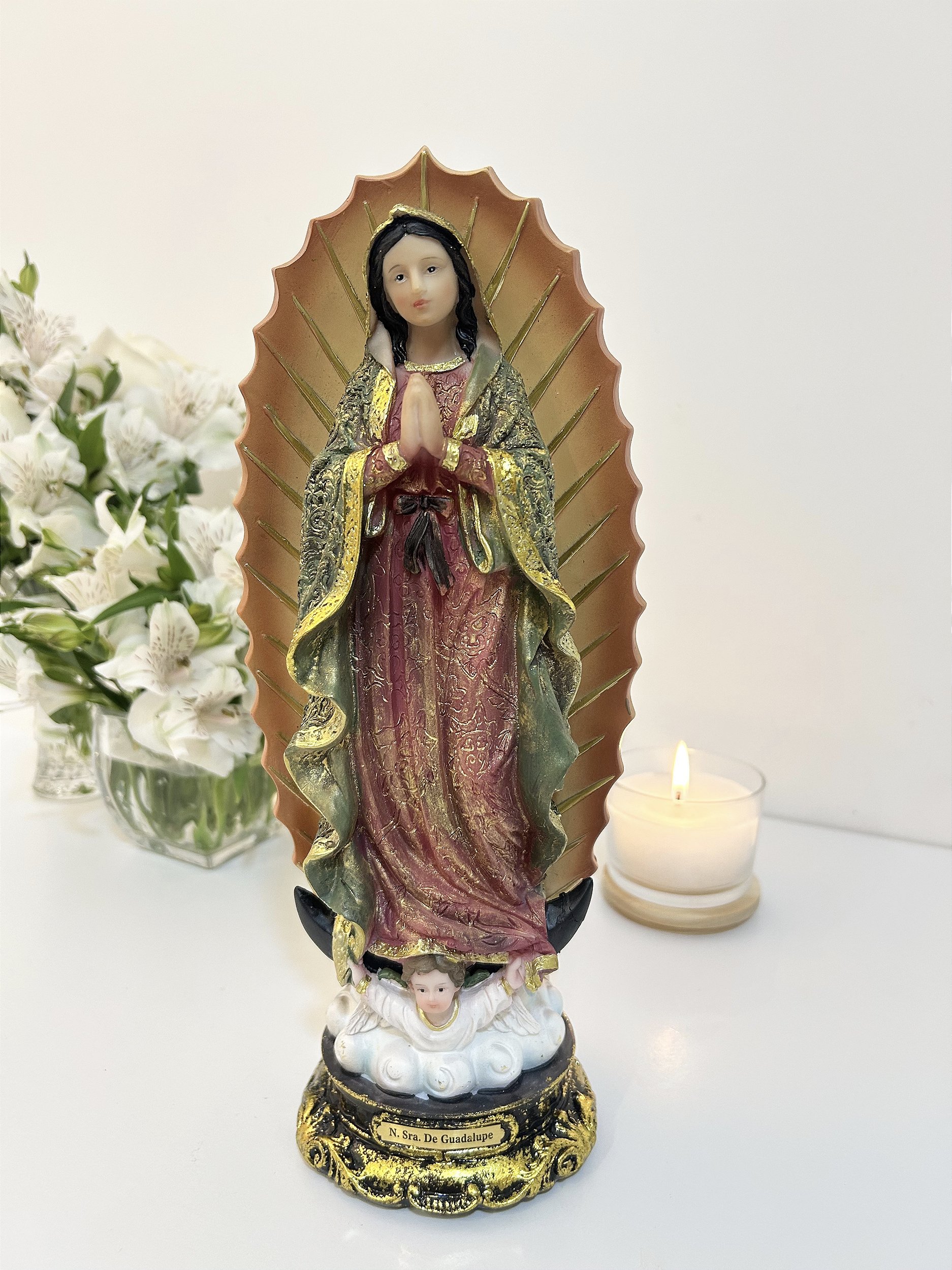 Linda imagem de Nossa Senhora de Guadalupe, padroeira das Américas e símbolo de fé, amor e proteção materna. Produzida em resina importada de alta qualidade, possui 30 cm de altura e apresenta detalhes delicados.