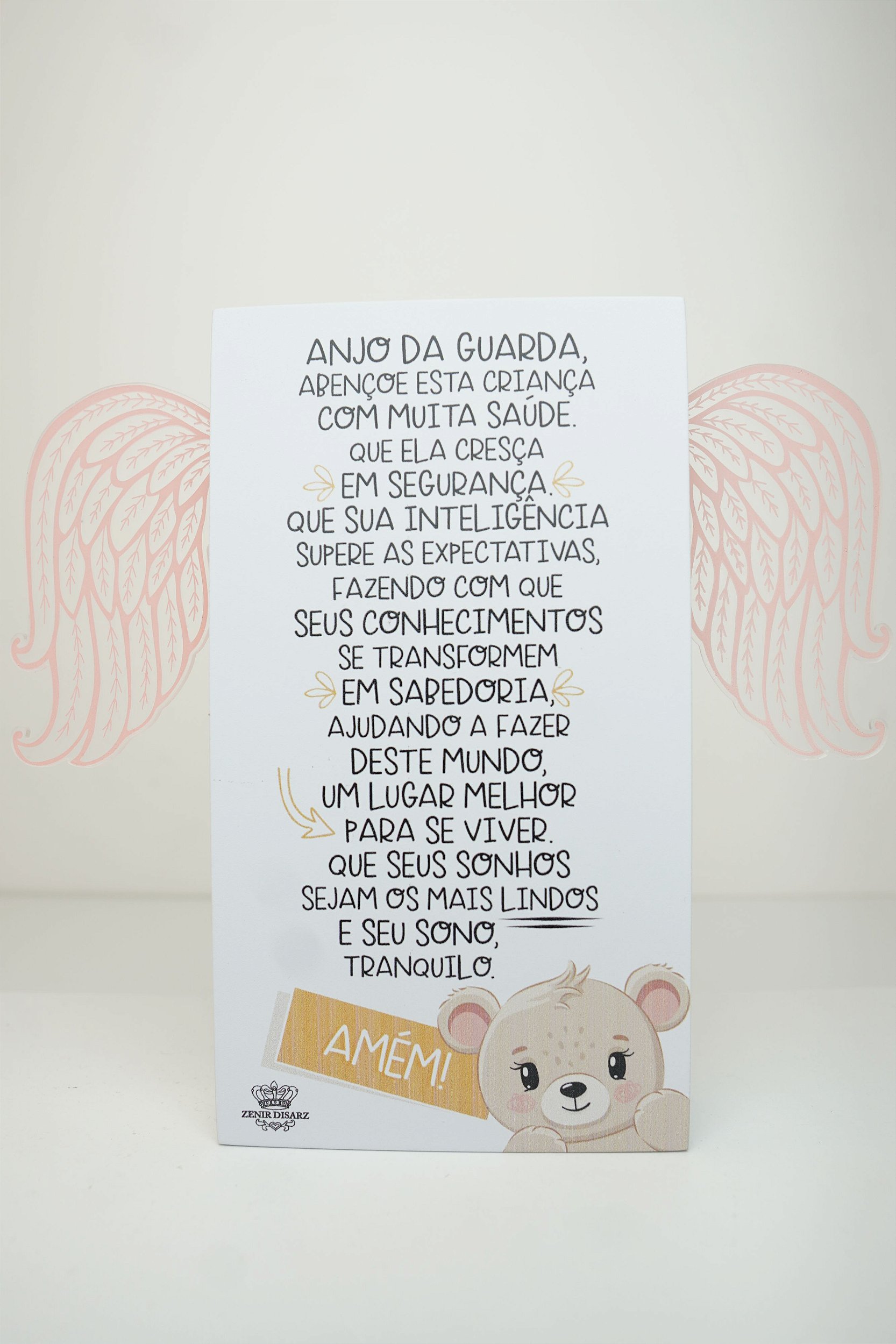 A Placa de Mesa Oração ao Anjo da Guarda com Asas – Rosa é uma peça devocional delicada, perfeita para transmitir fé e proteção. Produzida em MDF, traz estampada a oração ao Anjo da Guarda e possui asas decorativas que simbolizam cuidado e presença angelical. Seu acabamento em tom rosa a torna ideal para quartos infantis, oratórios ou para oferecer como presente em batizados e ocasiões religiosas especiais.