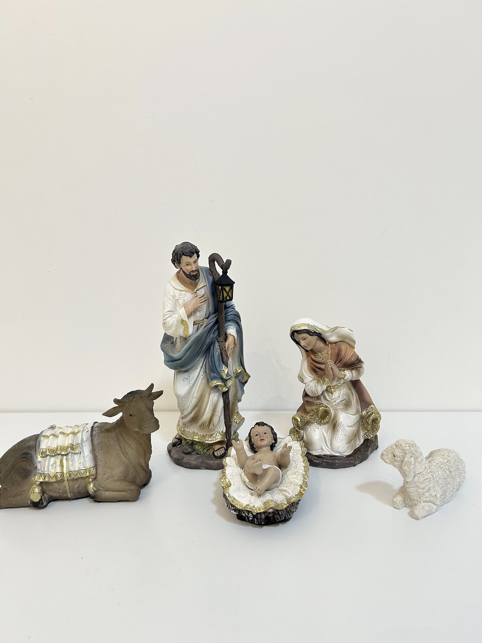 Conjunto com 5 peças (São José, Nossa Senhora, Menino Jesus, vaquinha e ovelhinha)