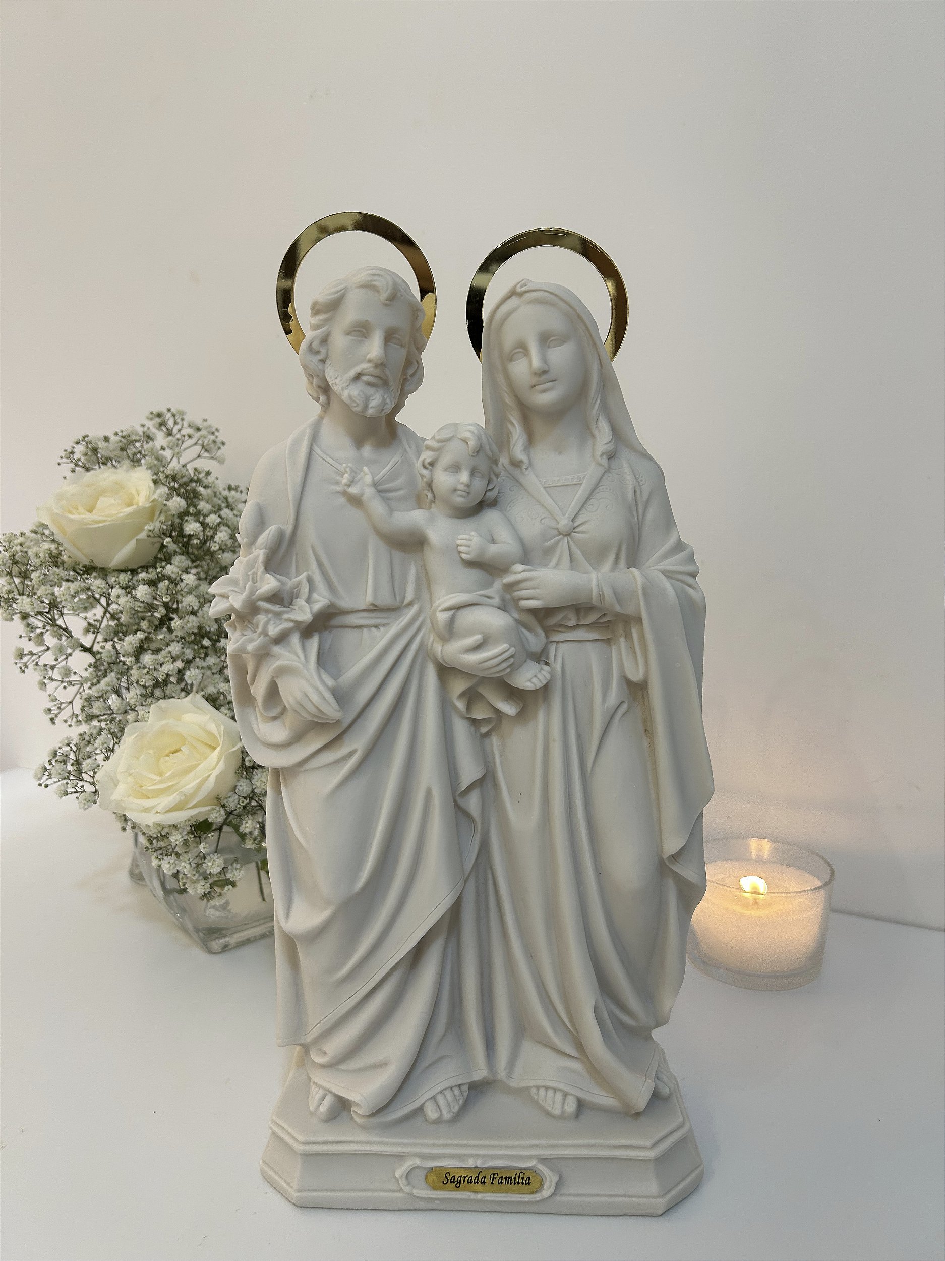 Sagrada Família em resina importada que expressa fé e devoção com detalhes delicados e acabamento branco com dourado nas auréolas.
