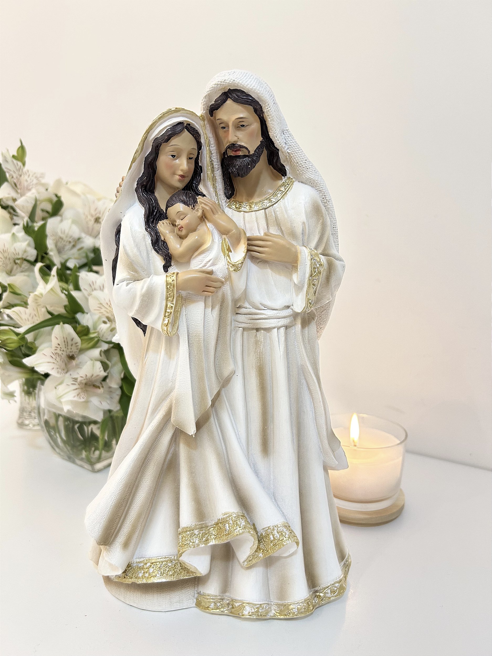 Linda imagem da Sagrada Família, representando Jesus, Maria e José em harmonia e ternura. A imagem, ricamente detalhada, traz acabamento em tons suaves com delicados toques dourados, transmitindo paz e devoção. Simboliza o amor, a fé e a união familiar cristã.