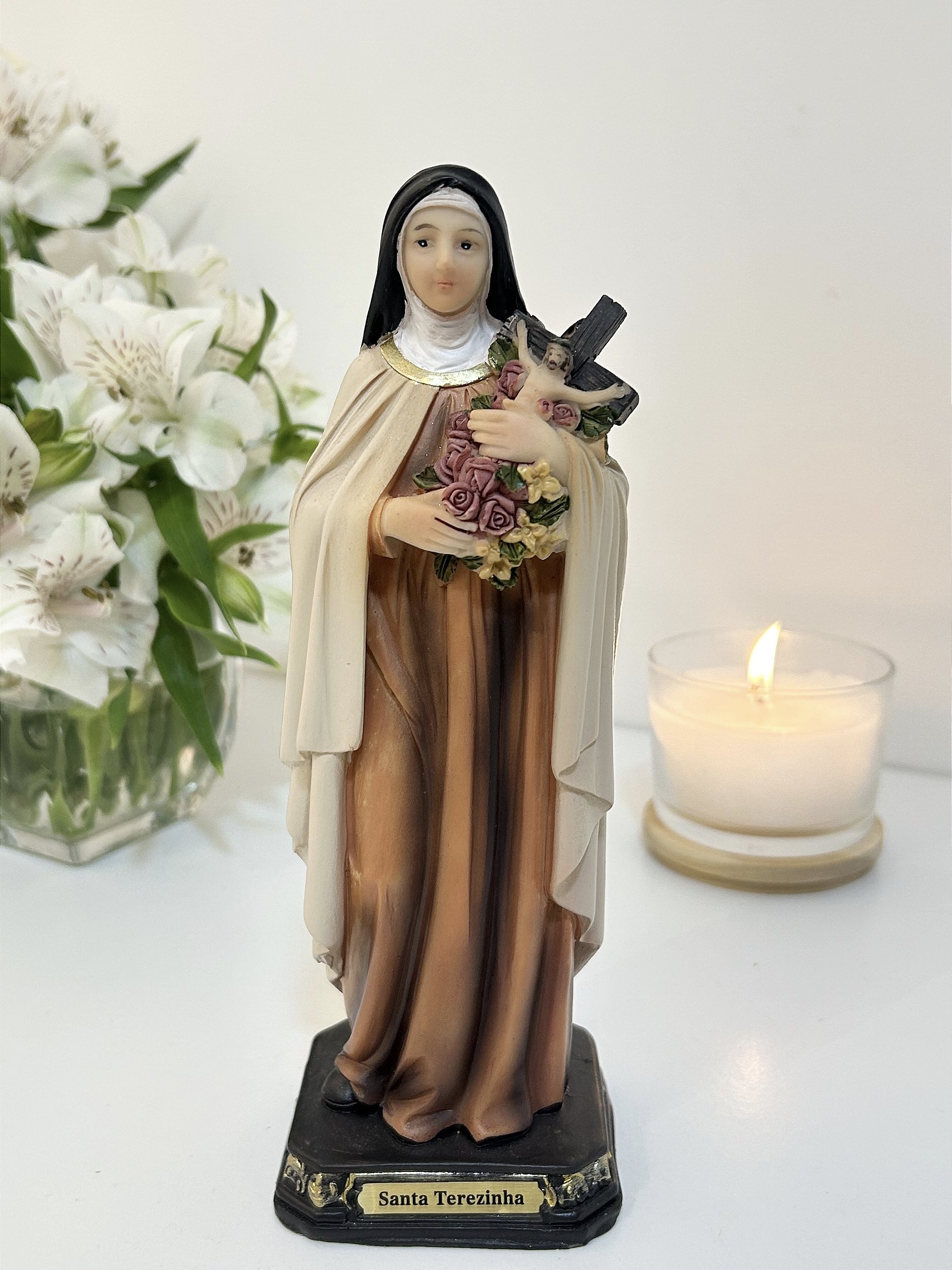 Santa Teresinha do Menino Jesus, conhecida como a “Santa das Rosas”, confeccionada em resina de alta qualidade e ricamente pintada à mão. Com 18 cm de altura, a peça apresenta delicadeza nos traços e riqueza de detalhes.