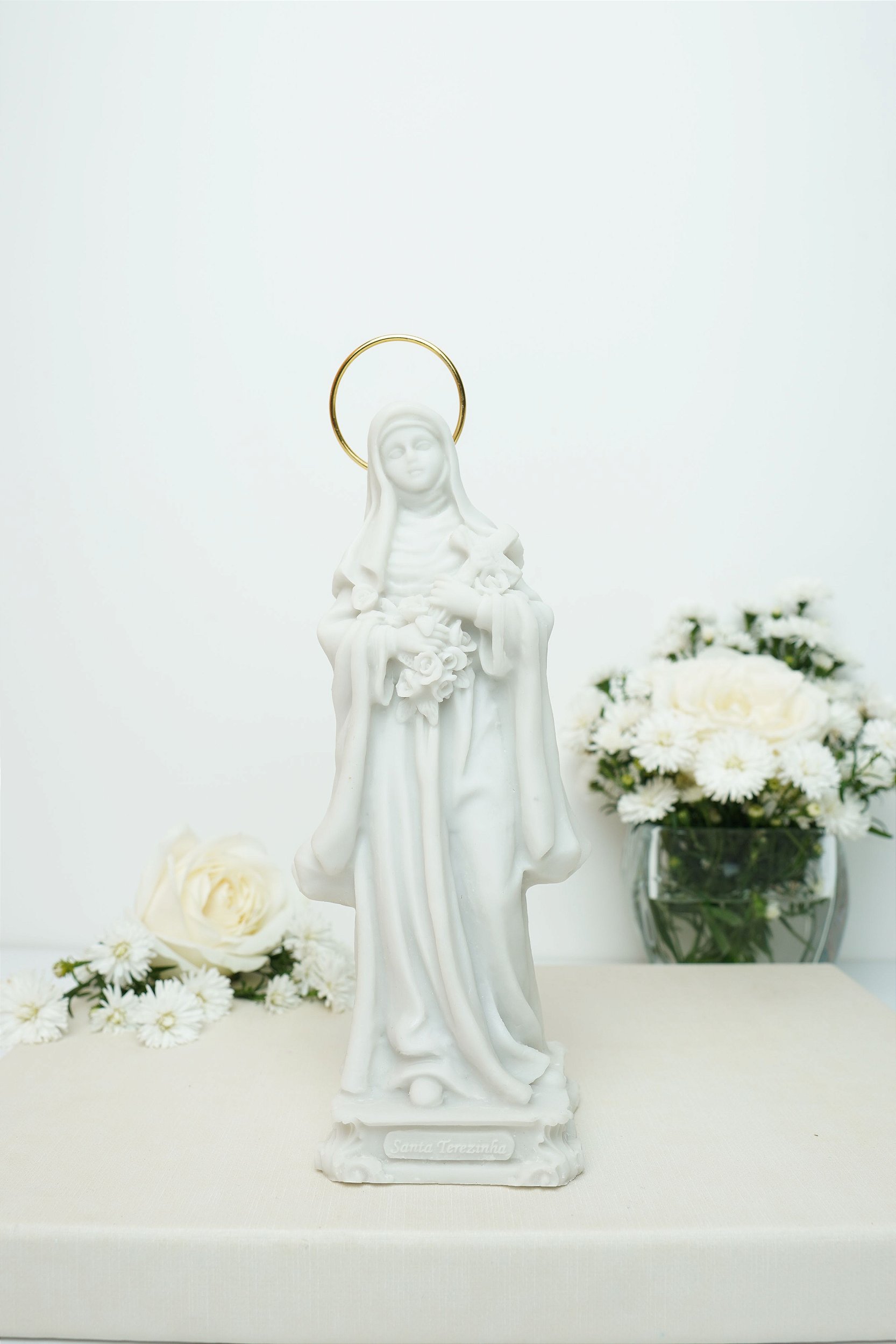 A Imagem de Santa Teresinha do Menino Jesus, confeccionada em resina branca com 15 cm de altura, representa a “pequena flor” que ensinou o caminho da simplicidade e do amor confiante em Cristo.