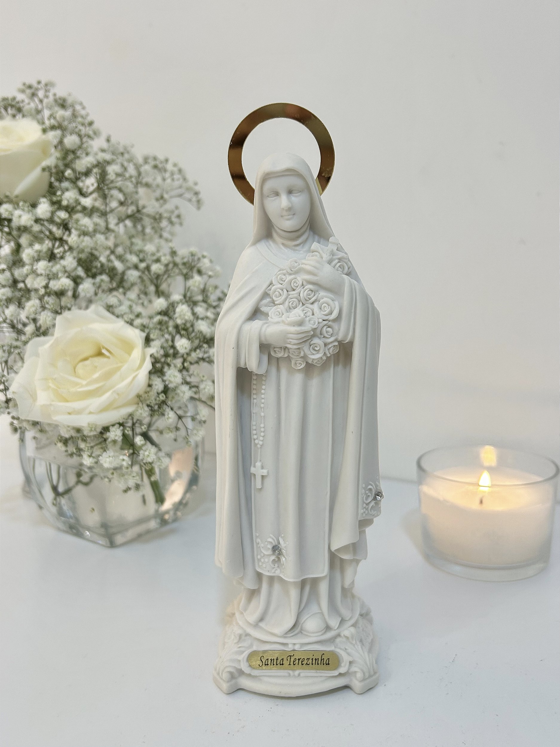 Essa imagem apresenta acabamento em resina branca importada com detalhes nas vestes brilhoso e nas flores que Santa Teresinha segura, além de uma auréola dourada. É uma imagem perfeita para quem deseja uma decoração religiosa com toque de elegância e simplicidade.