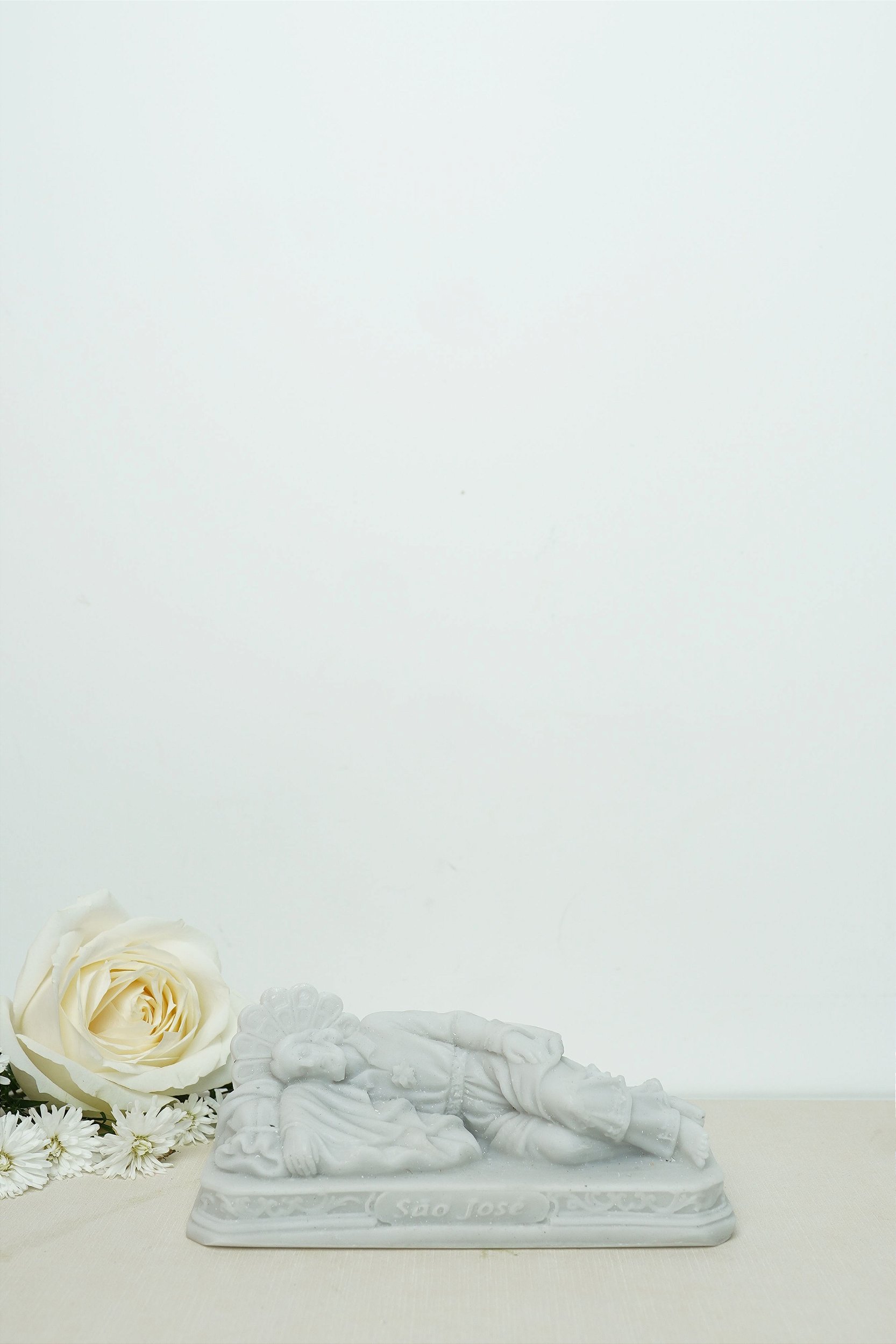 Linda imagem de São José Dormindo, confeccionada em resina branca. Retrata São José dormindo, simbolizando a confiança total nos desígnios de Deus e a escuta atenta de Suas mensagens em sonhos.