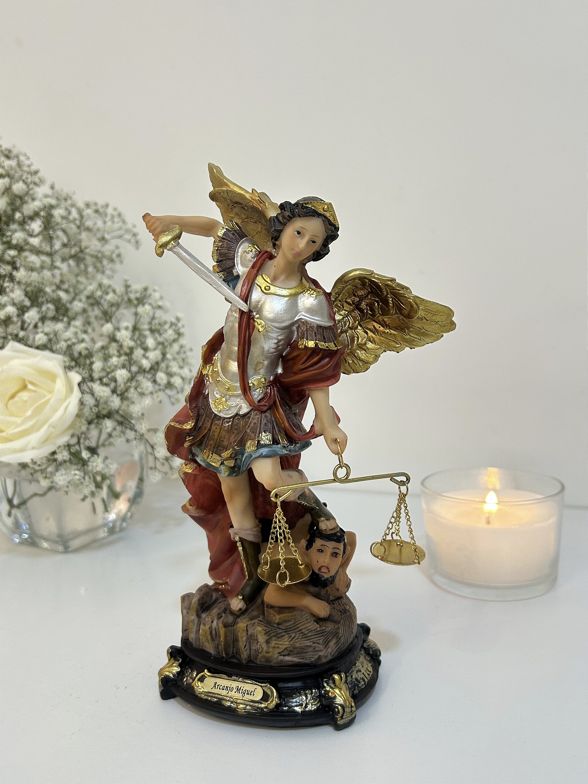 Imagem de São Miguel Arcanjo, 20 cm, detalhado e resistente para sua casa ou altar, feito em resina importada com acabamento refinado.