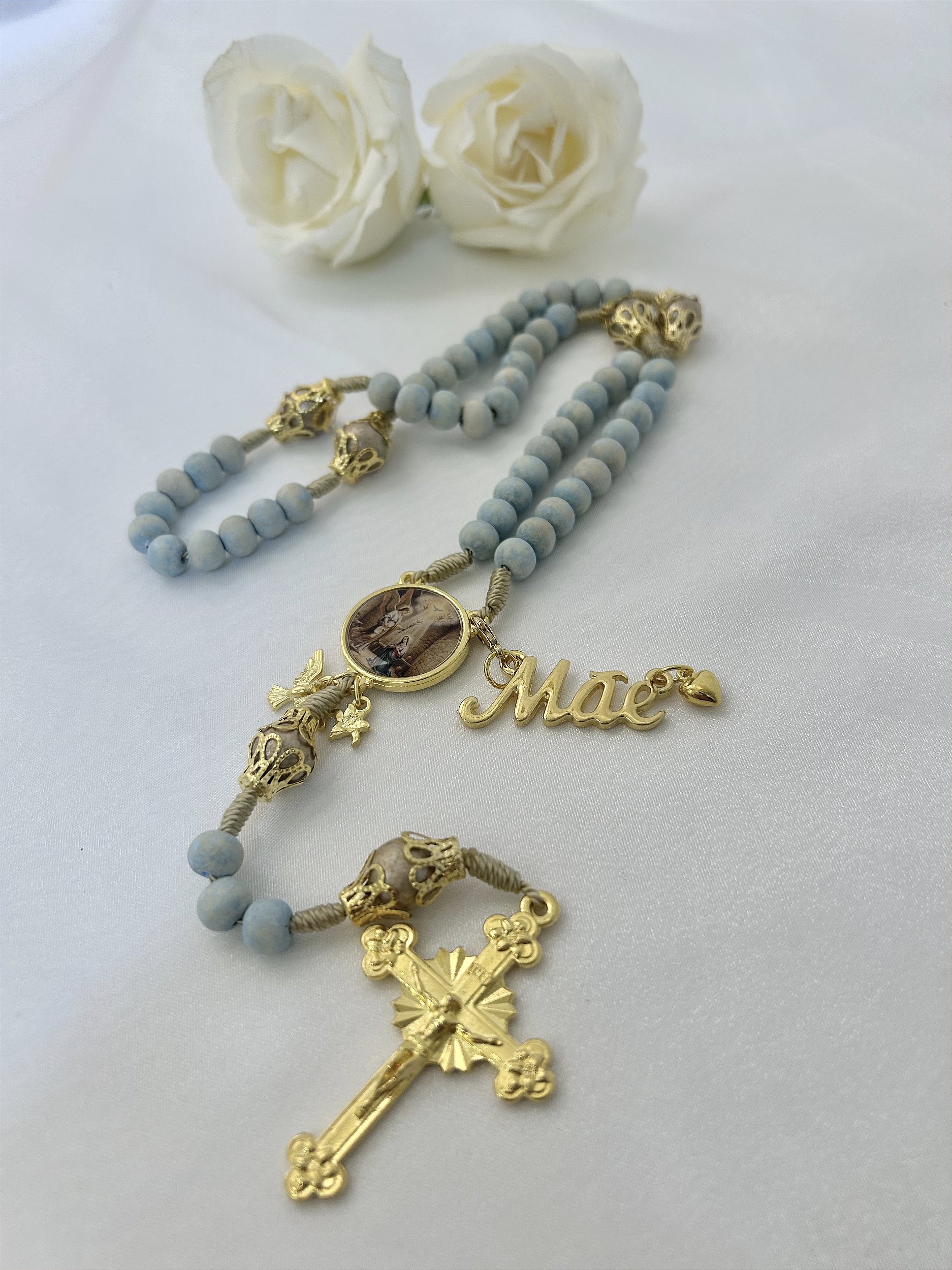 Este terço da Anunciação é uma peça religiosa feita para fortalecer a fé no cotidiano. Contando com contas azuis e detalhes dourados, ele oferece resistência e um acabamento delicado para uso constante.