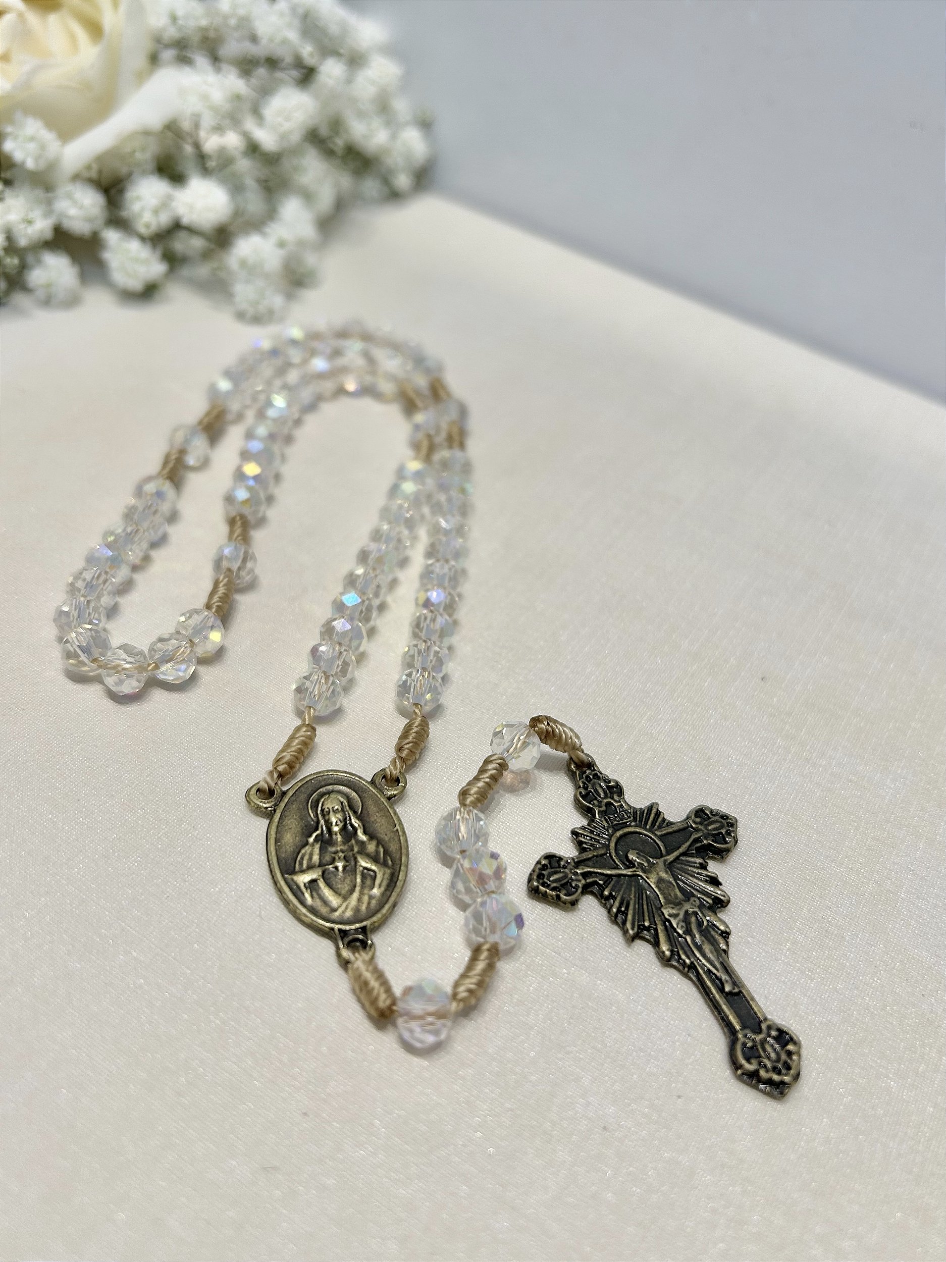 Terço de bolso Nossa Senhora das Graças e Sagrado Coração de Jesus, exclusivo Confiat é uma peça compacta e resistênte, ideal para quem busca fé e proteção no dia a dia. Suas contas são feitas de cristal transparente com acabamento brilhante, conferindo elegância e durabilidade. O terço possui crucifixo detalhado e medalhas com imagens em metal envelhecido, que garantem um toque tradicional e reverente. Além disso, seu tamanho compacto facilita o transporte e uso a qualquer momento, tornando-o prático para momentos de oração e devoção.