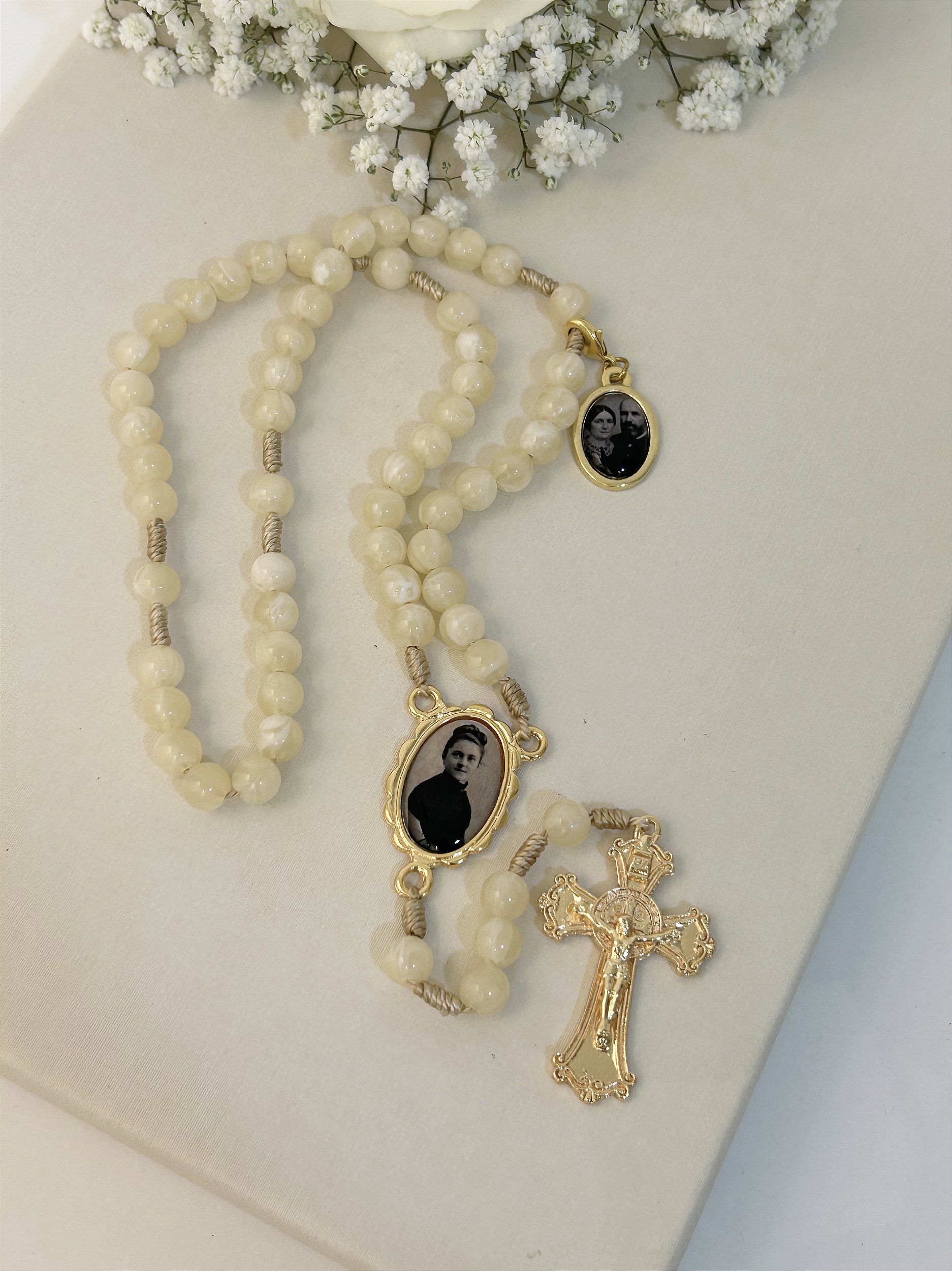 Este terço de Santa Teresinha possui contas brancas que facilitam o manuseio e uma cruz trabalhada em tom dourado e pingente dos pais de Santa Teresinha: São Luis e Santa Zélia.