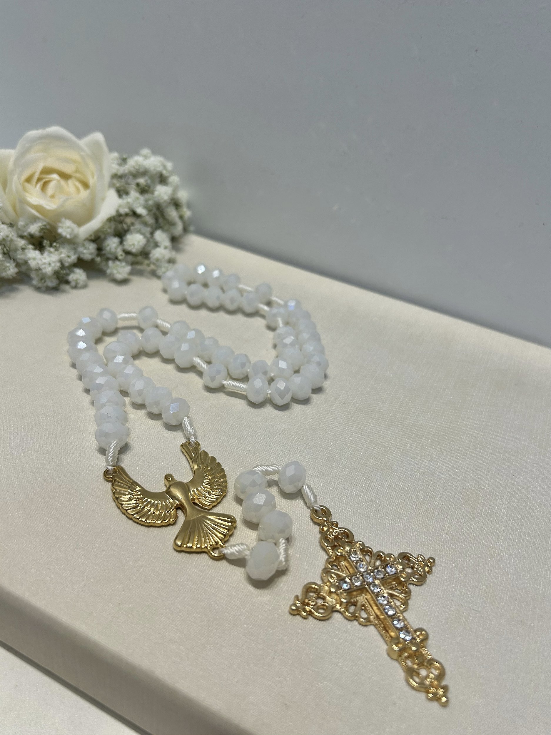 Terço do Espírito Santo, exclusivo Confiat, em cristal de 10 mm, ideal para momentos de fé e reflexão. Este terço é feito com contas facetadas que ressaltam o brilho e a beleza do cristal. Possui um entremeio detalhado e delicado do Espírito Santo em acabamento dourado e detalhes em strass. Ideal para presentear em Batizados, Crisma ou para uso pessoal.