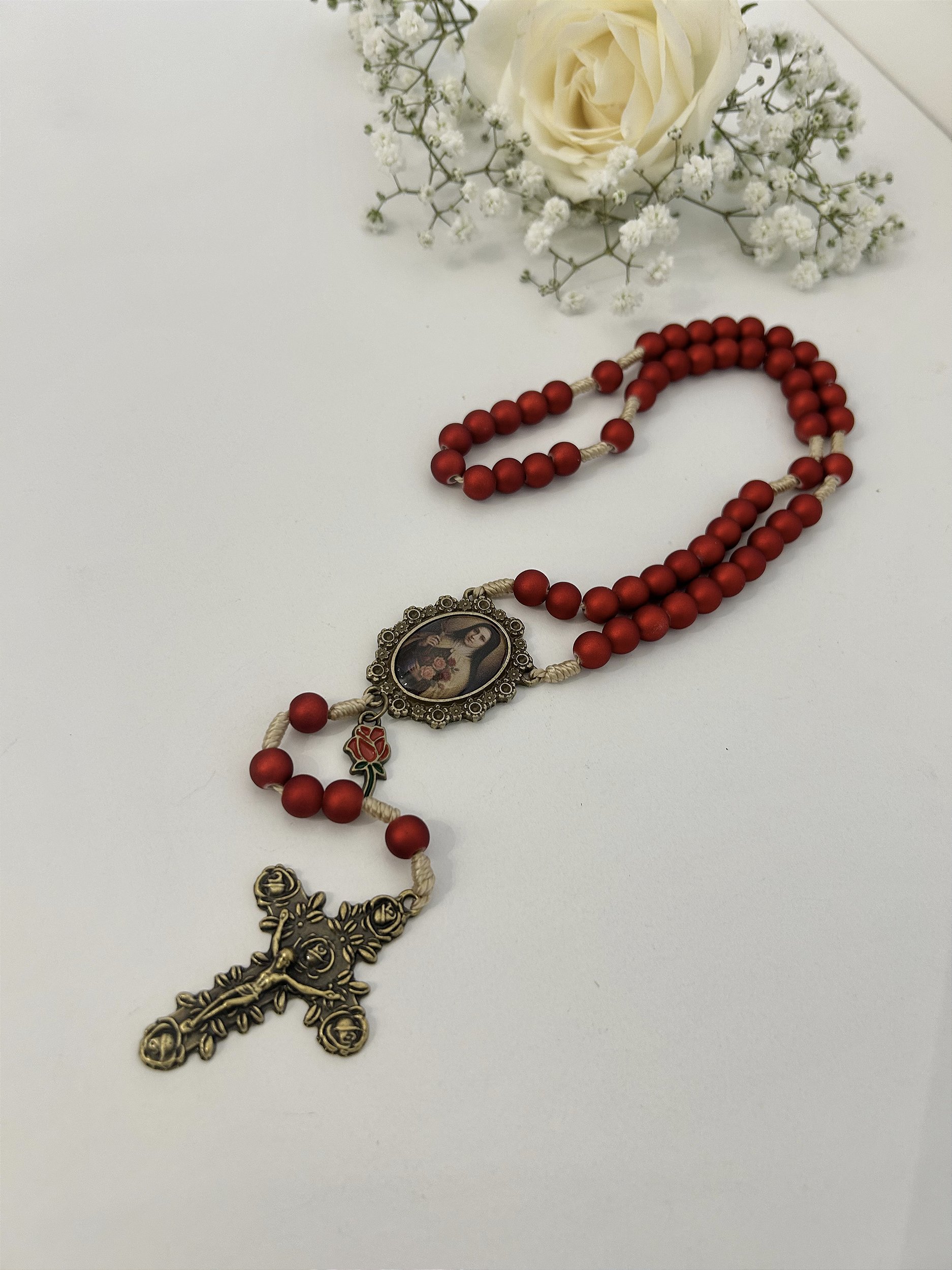 Inspire a sua caminhada de fé com o deslumbrante Terço Pequena Flor, uma belíssima homenagem a Santa Teresinha do Menino Jesus, a "Santa das Rosas". Cuidadosamente montado para oferecer conforto e durabilidade durante suas orações diárias, este terço possui um toque único e um visual marcante.