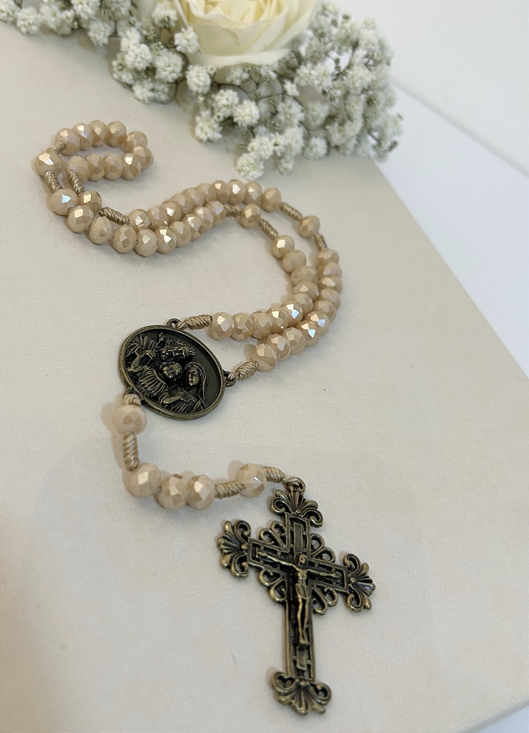 O Terço Sagrada Família é uma peça com contas de cristal bege que une beleza e espiritualidade. Com acabamento detalhado, apresenta crucifixo tradicional e medalha central com imagem da Sagrada Família em alto relevo, em metal.